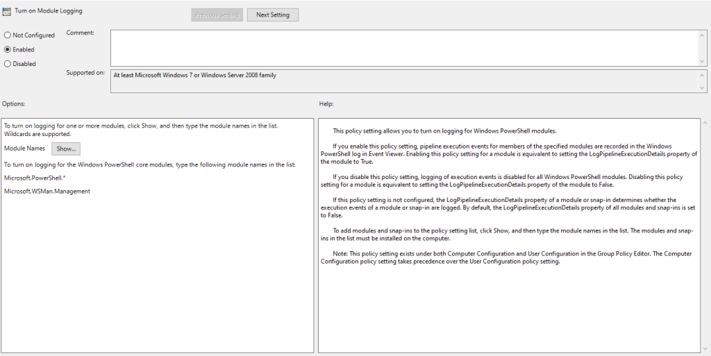 Furthermore, Module Logging is a policy that logs all pipeline execution events for specified module members. Essentially, whenever a module is called or executed a log entry is made. If you add Microsoft.PowerShell.* to this policy, all default PowerShell modules will make a log entry when they are used.