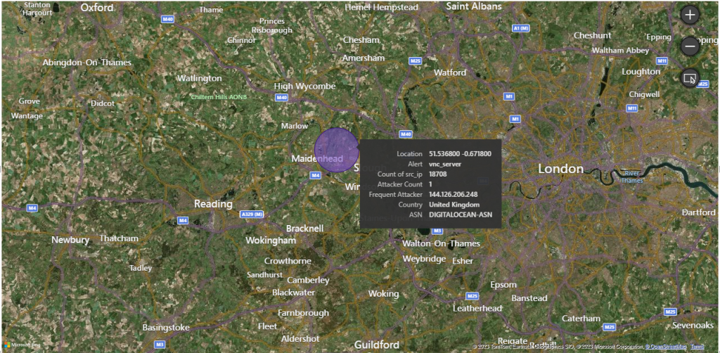The address with the most connections was 144[.]126[.][206[.]248 and they exclusively targeted VNC. This address made 18.71k, or 36.39% of all connections. It is located outside of London and is attributed with approximately 94% of all traffic from the United Kingdom.