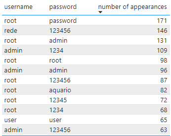 Additionally, the most common authentication attempt was root:password, with 171 connections across all services attempting those credentials.